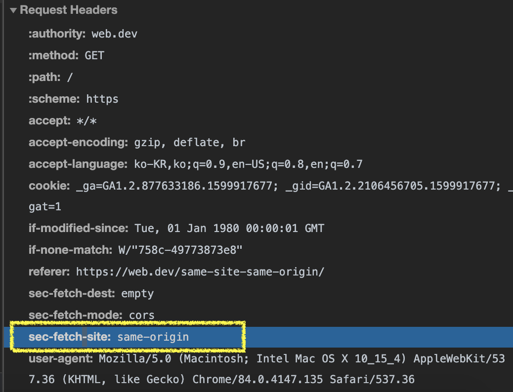 chrome에서는 HTTP 요청 시, same-site, same-origin, cross-site 여부를 Sec-Fetch-Site Reuqest Header에 담아 보낸다.