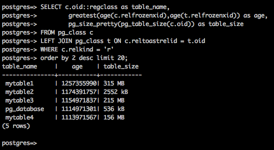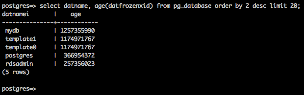SELECT datname, age(datfrozenxid) FROM pg_database ORDER BY 2 DESC LIMIT 20;