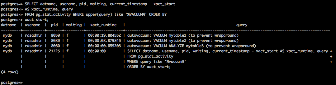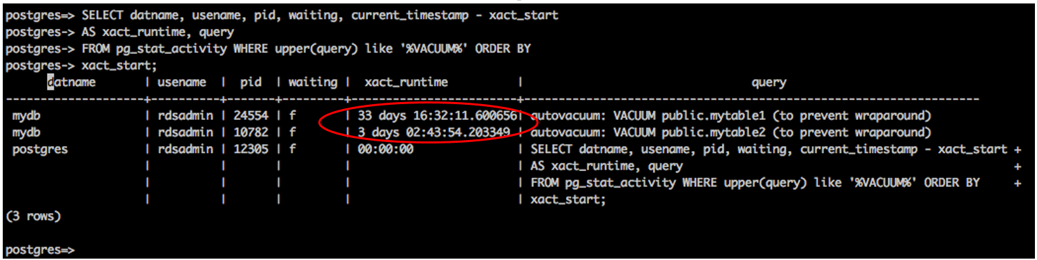 SELECT datname, usename, pid, current_timestamp - xact_start AS xact_runtime, query