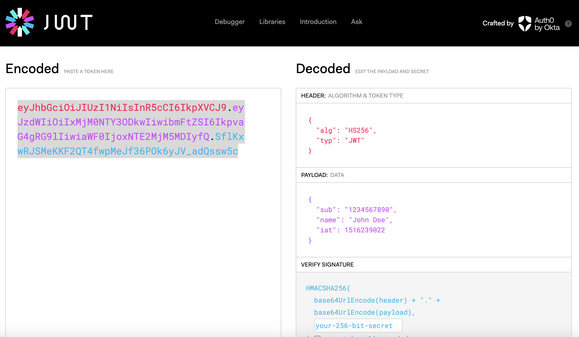 JWT 구성을 살펴보자. JWT은 3가지 구성요소로 나뉜다. 각 구성영역은 토큰의 점으로 구분된다.