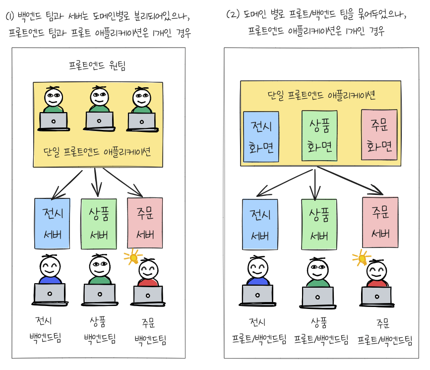 - 도메인 별로 팀을 묶어두었으나, 프론트엔드 애플리케이션은 1개인 케이스다.