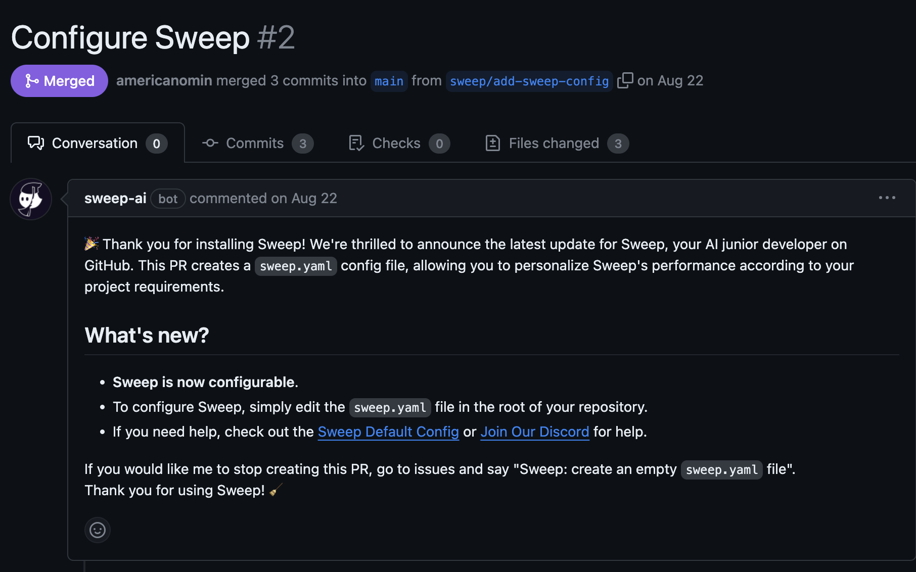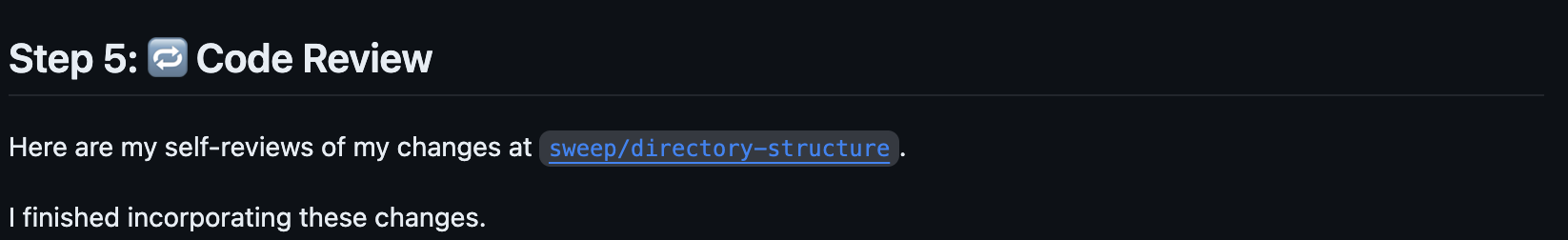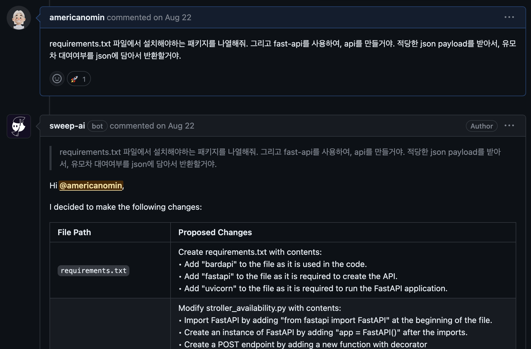 작업 내용은 Sweep이 PR으로 올려준다. PR에서 코멘트로 피드백이 가능하다.