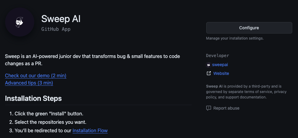Github App에서 나의 github과 Sweep AI 애플리케이션을 연동한다.