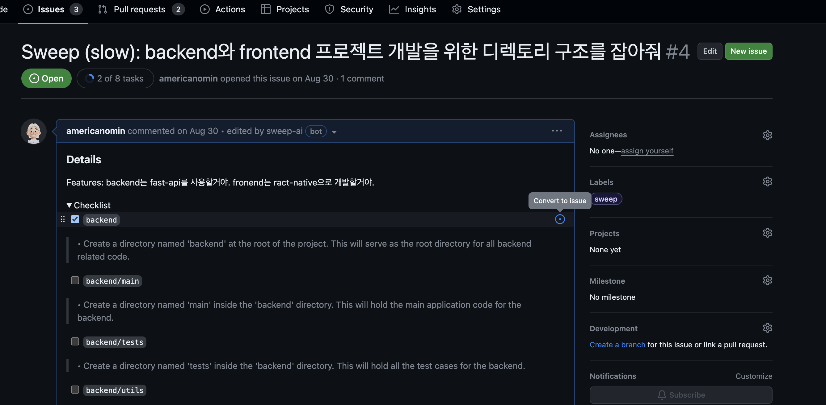 sweep ai은 버그 리포트와 피쳐 리퀘스트를 코드로 만들어주는 AI 기능이다.