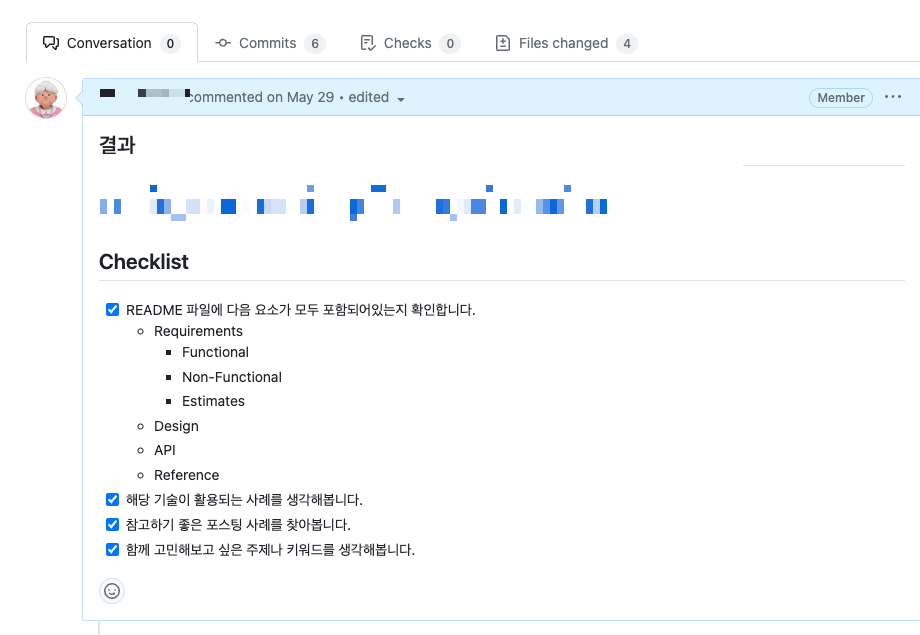 - [ ] README 파일에 다음 요소가 모두 포함되어있는지 확인합니다.