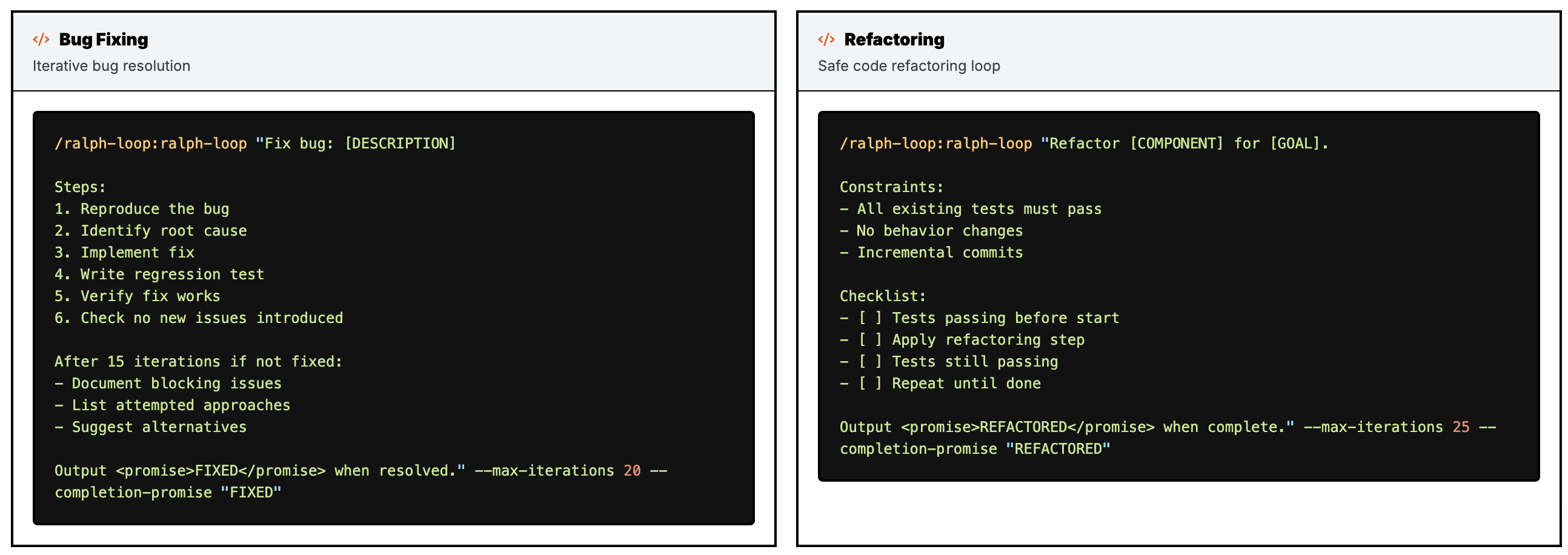 | 자기 교정 패턴 | 기능 X에 대한 코드를 작성합니다. | TDD(테스트 주도 개발) 방식으로 기능 X를 구현한다. 1. 실패하는 테스트를 작성합니다 2. 기능을 구현합니다 3. 테스트를 실행합니다 4. 실패하는 테스트가 있으면 디버깅하고 수정합니다 5. 필요한 경우 리팩토링합니다 6. 모든 테스트가 통과될 때까지 반복합니다 7. 출력: "<promise>COMPLETE</promise>" |