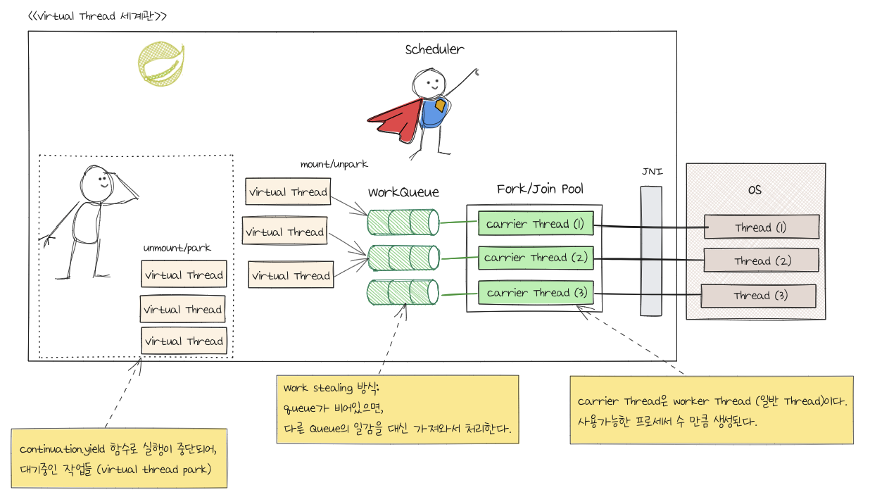 JDK 21에 추가된 경량 쓰레드이다. OS 쓰레드를 사용하지 않고 JVM 내부 스케줄링을 통해 쓰레드를 생성한다.